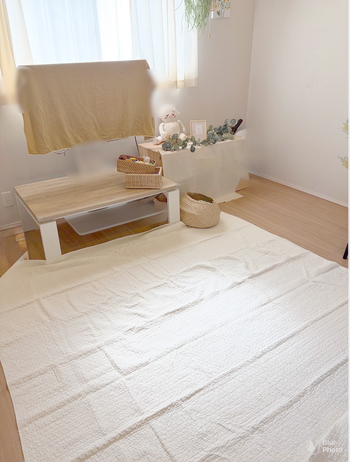 床の冷たさや硬さが直接伝わらないよう、やわらかいラグとマットを重ねています。